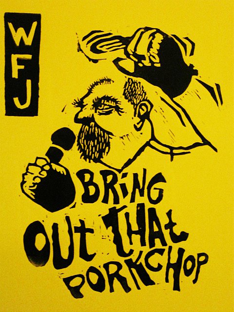 As part of the world premiere of Wrestling For Jesus at the Wisconsin Film Festival, I’ve commissioned some artist friends to create some pieces inspired by the film. Today, the first piece came in which was created by print maker and linocut guru, Gary Nauman and is part of a series he’s doing. (FYI, “Bring Out That Porkchop” is a line in the film).